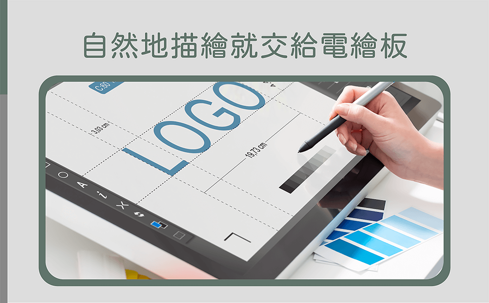 我們可以將手繪圖稿掃描進入電腦並儲存成影像檔,再透過「電繪板」將該份手繪圖檔進行著色。這樣的操作方法可避免上色於手繪稿卻需要調整的情況,而電繪板不僅易於調整色彩外,也在繪製上提供很的大幫助,例如自己設計Logo過程有時會手誤,而透過電繪板的復原功能會是個很棒、且方便的工具!以上作法,其中沒有絕對的好與壞,端看自己設計Logo時的方便性。